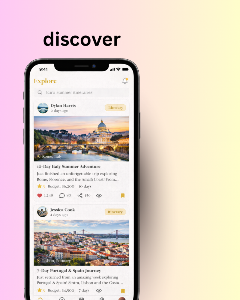 Travel Nova gives you the freedom to share your own travel itineraries while exploring real itineraries created by other travellers. Discover new ideas on what to do, where to go, and how to plan your trip — all from people who have actually experienced it. At the same time, you can inspire others by sharing your own journeys, creating a space where travel inspiration is constantly exchanged.